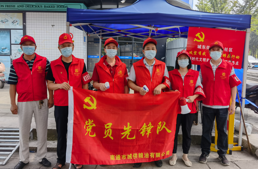 黨旗所指,團旗所向。為充分發揮黨員先鋒模范作用,青年帶頭作用,城供公司成立了黨員先鋒隊、青年突擊隊。27日下午,張垛儲備庫青年突擊隊成員們利用工作外時間前往海安市雅周鎮興雅社區,穿上紅馬夾,戴上紅帽子,為進入小區居民測體溫、查看行程碼;公司本部青年突擊隊隊員們伴隨烈日,前往濠東社區開展除草、地面清潔等志愿服務,經過大家共同勞動,社區面貌得到了較大改善。