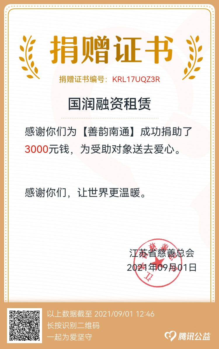 為大力弘揚中華民族扶貧濟困的優良傳統,發揮慈善在脫貧攻堅中的積極作用,按照市民政局等單位《2021年“博愛在南通 慈善暖江海”一日捐活動方案》的通知要求,國潤租賃組織全體員工于9月1日開展了線上一日捐活動。