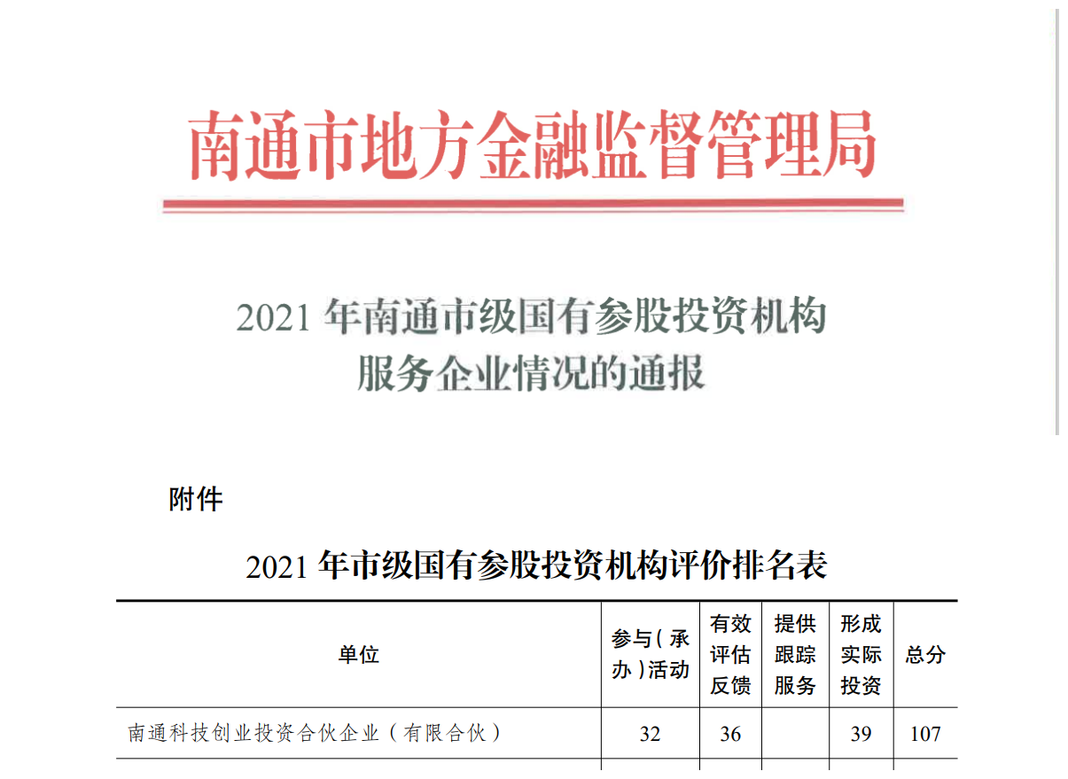 2021年,科創(chuàng)管理圍繞市金融局股權投融資對接“六個一”服務機制,積極參加“江海創(chuàng)投行”等股權投融資對接活動,并在活動后及時詳盡反饋、提供后續(xù)跟蹤服務、提出合理投融資建議,最終形成實際投資情況。科創(chuàng)管理公司管理的科創(chuàng)基金二期2021年共投資我市科創(chuàng)屬性企業(yè)3家,投資總額5000萬元,進一步助力了我市創(chuàng)新經(jīng)濟發(fā)展,在市金融局2021年市級國有參股投資機構服務企業(yè)排名中榮獲第一。 下一步,科創(chuàng)管理將繼續(xù)發(fā)揮國資創(chuàng)投企業(yè)優(yōu)勢,堅持政府引導意圖和市場化運作相結合,圍繞市重點產(chǎn)業(yè)發(fā)展目標,投向符合市產(chǎn)業(yè)發(fā)展方向的科技成果轉化、人才技術引進等創(chuàng)新創(chuàng)業(yè)項目,助力南通市產(chǎn)業(yè)發(fā)展升級。 |